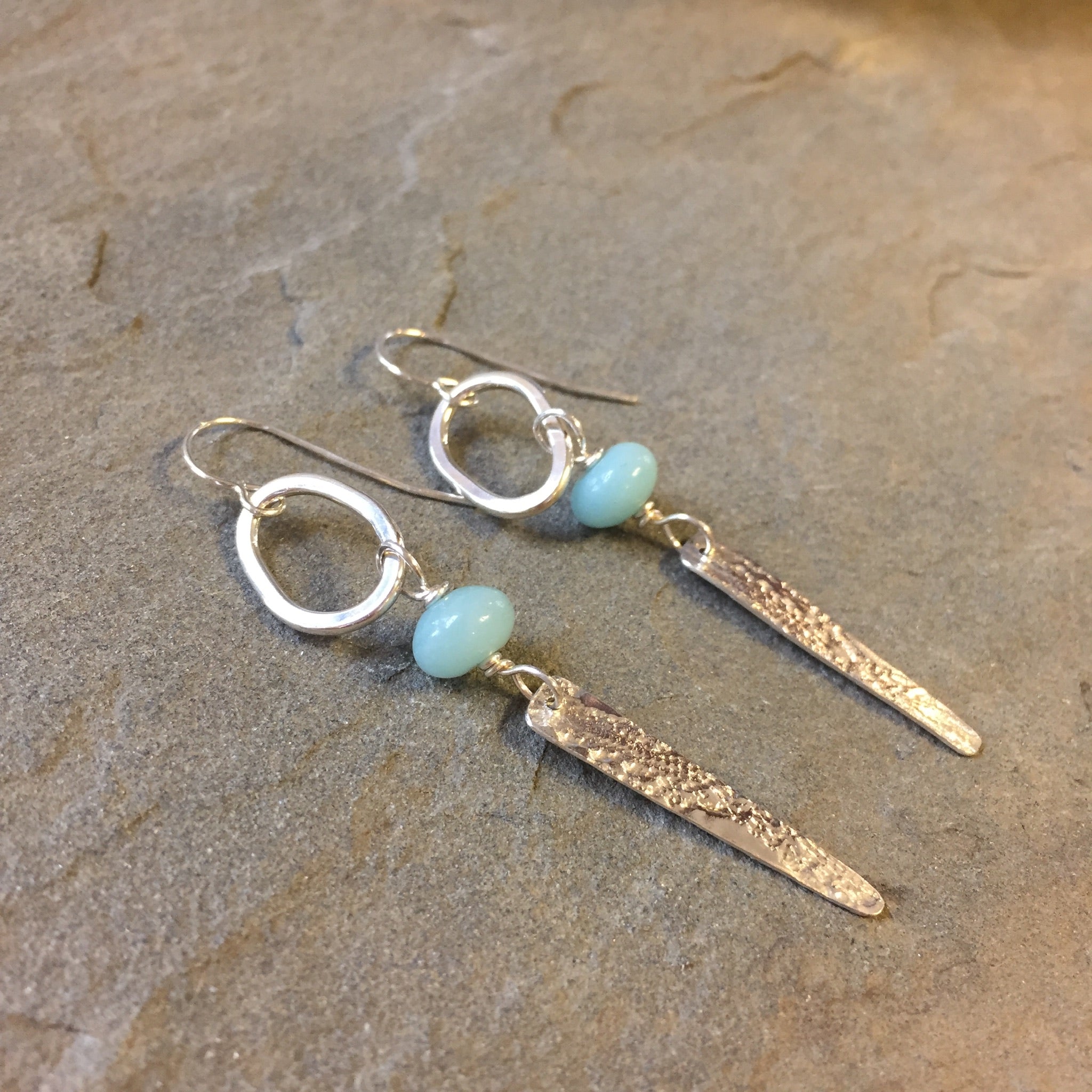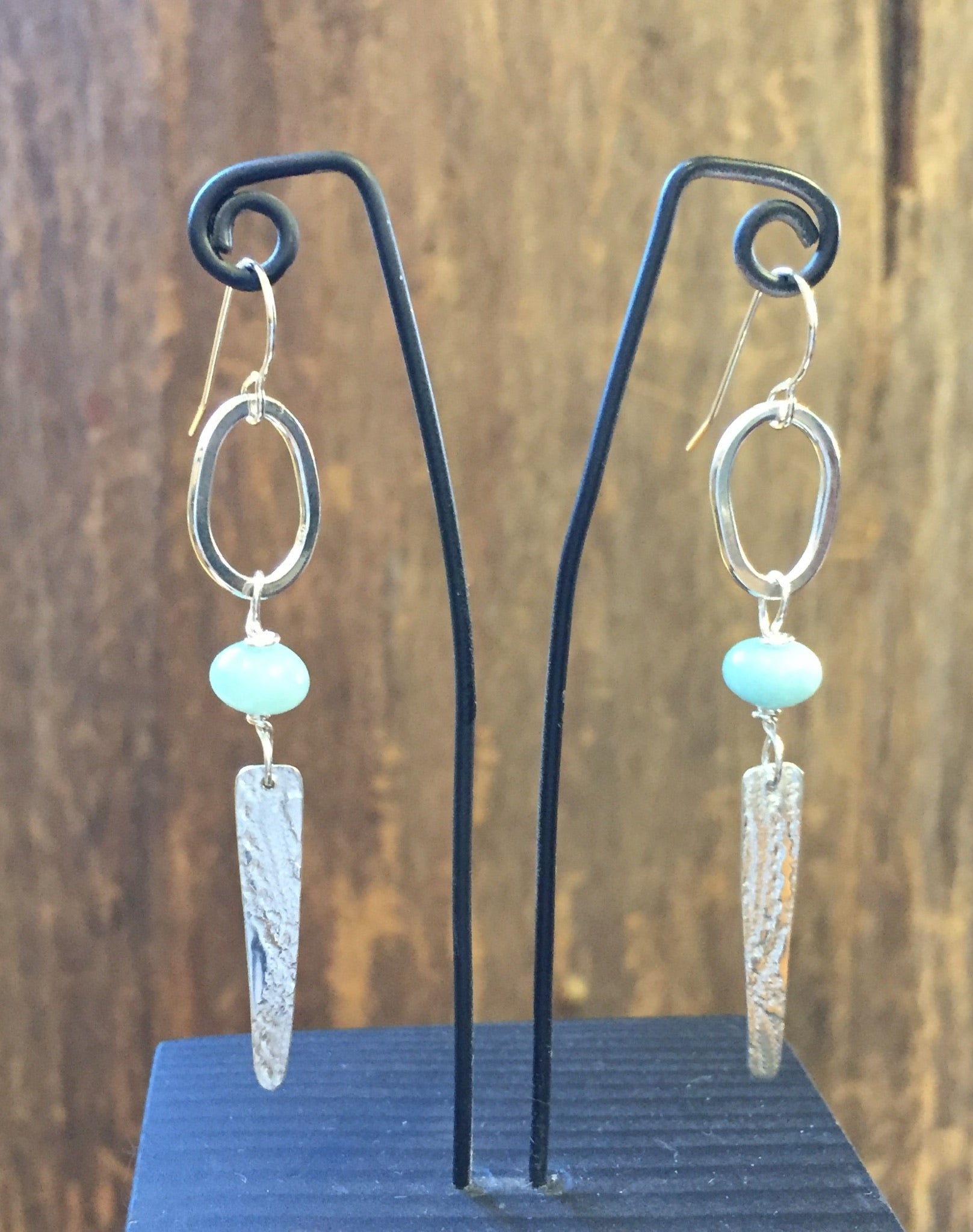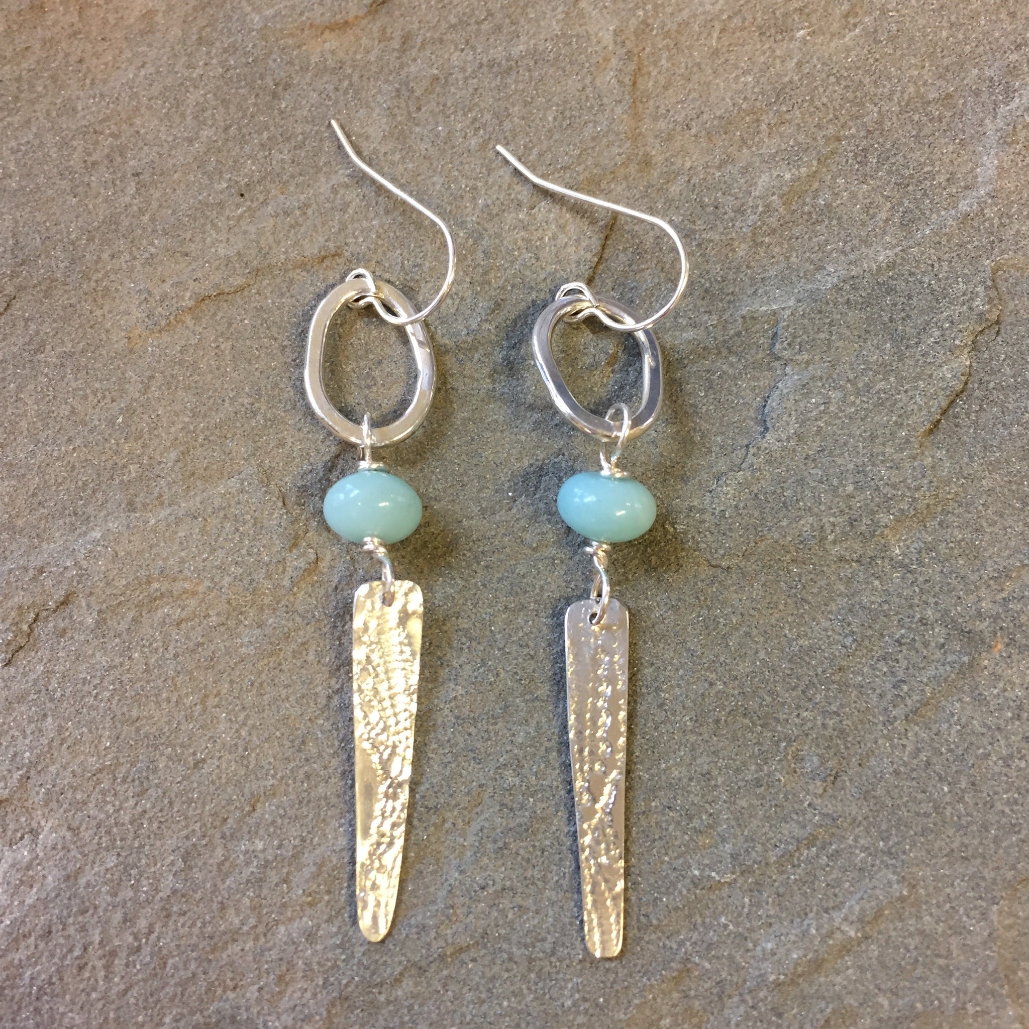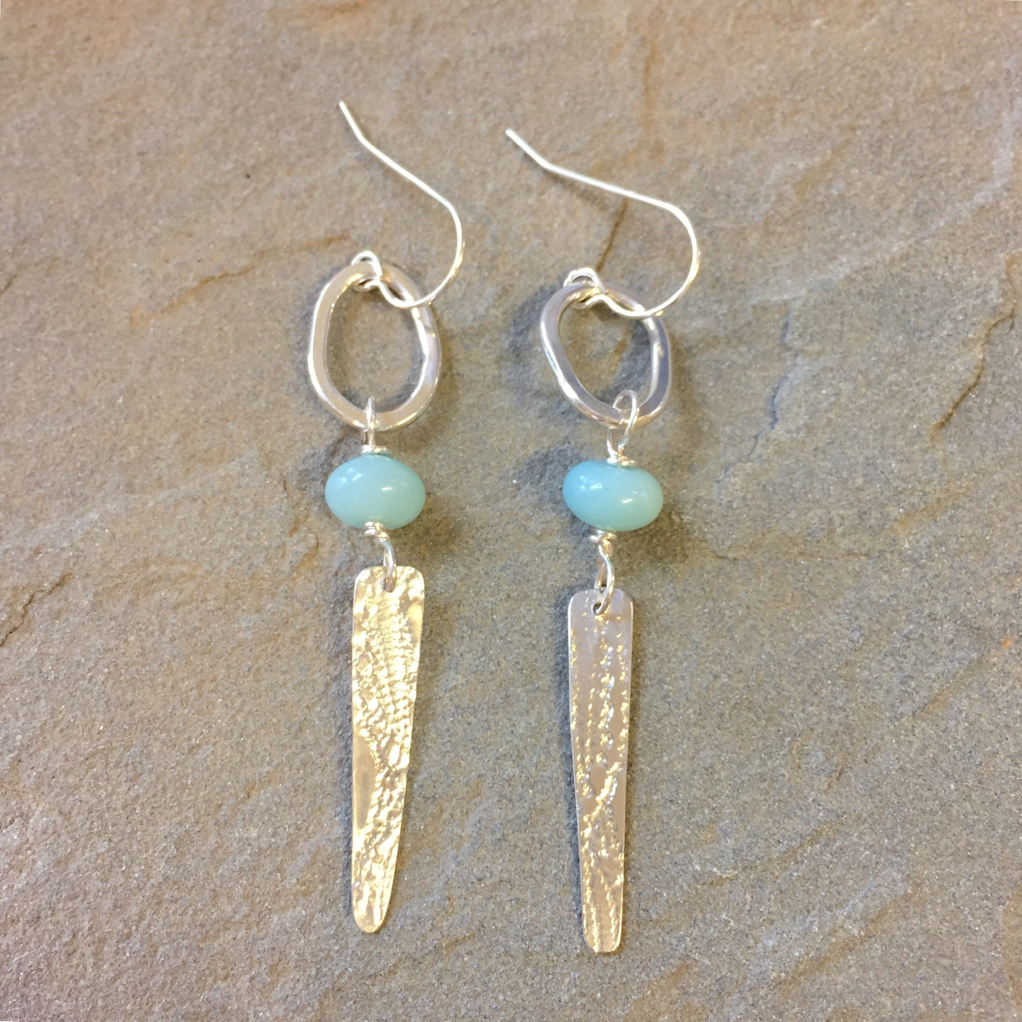 These sterling silver long elegant dangles swing lightly in the breeze and as you move. Featuring an open shiny silver oval with 8mm amazonite rondelles followed by a hand cut, textured long sterling silver triangle.