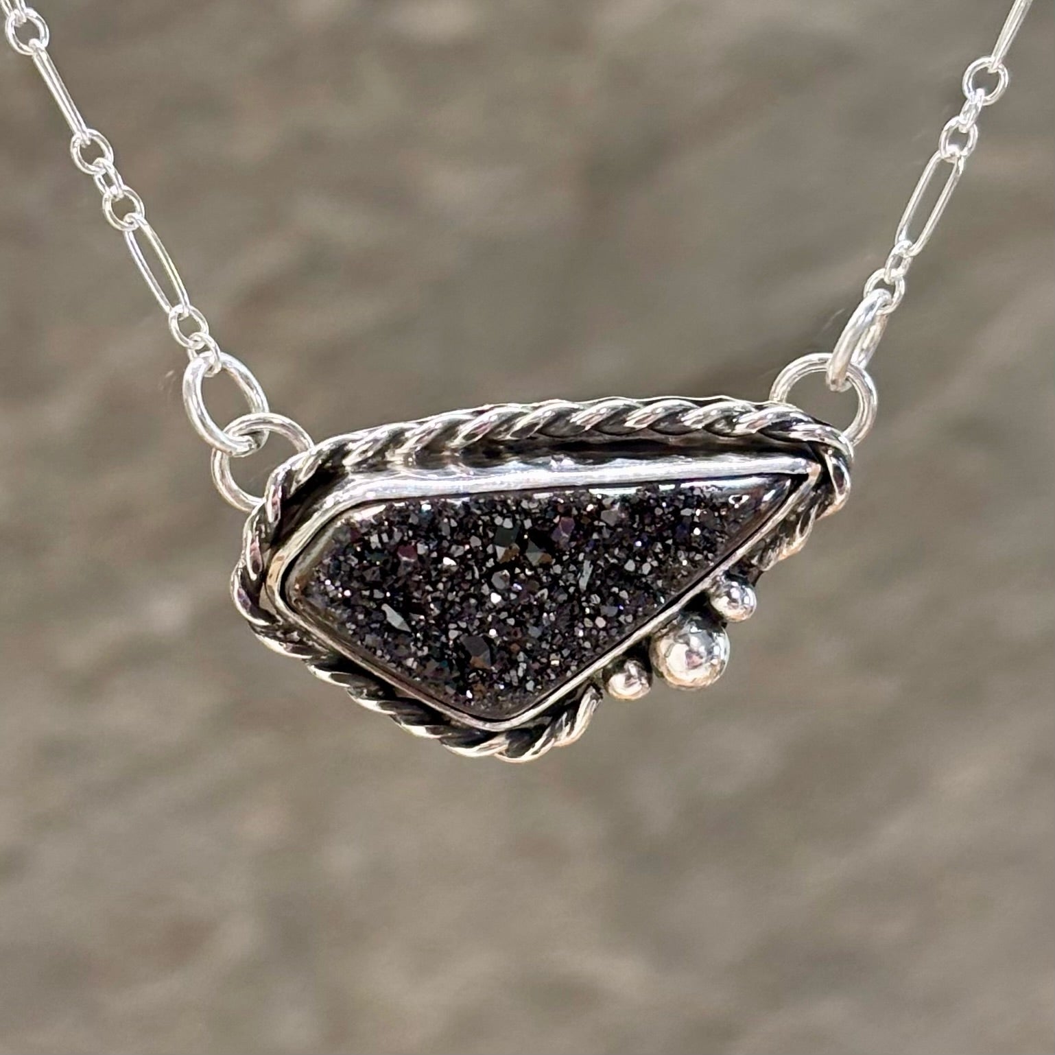 A one-of-a-kind sterling-silver necklace featuring a titanium-coated black druzy framed in twisted silver on a split chain.