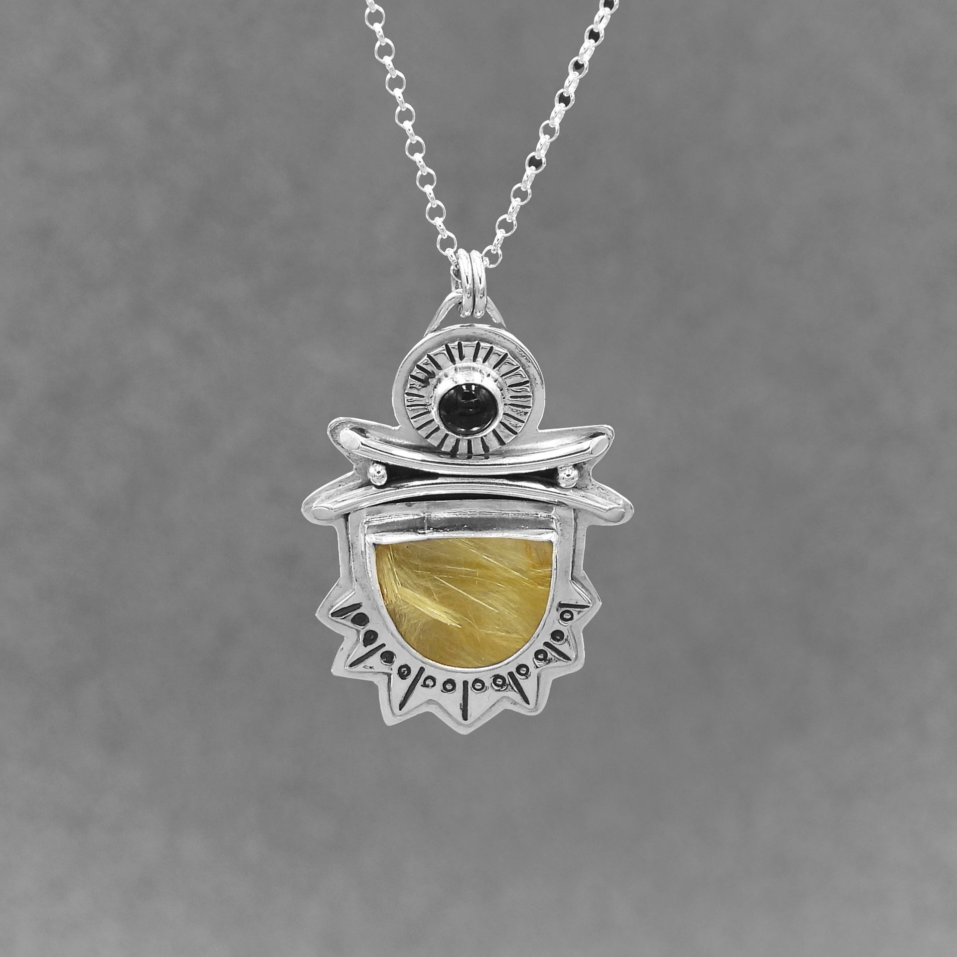 The Tamara pendant is a bold, handcrafted piece that balances structure with radiance. A polished golden rutilated quartz sits at the center, framed in sterling silver with crisp, intentional lines and hand-stamped detail. At the top, a single tourmaline adds contrast and a quiet strength.
