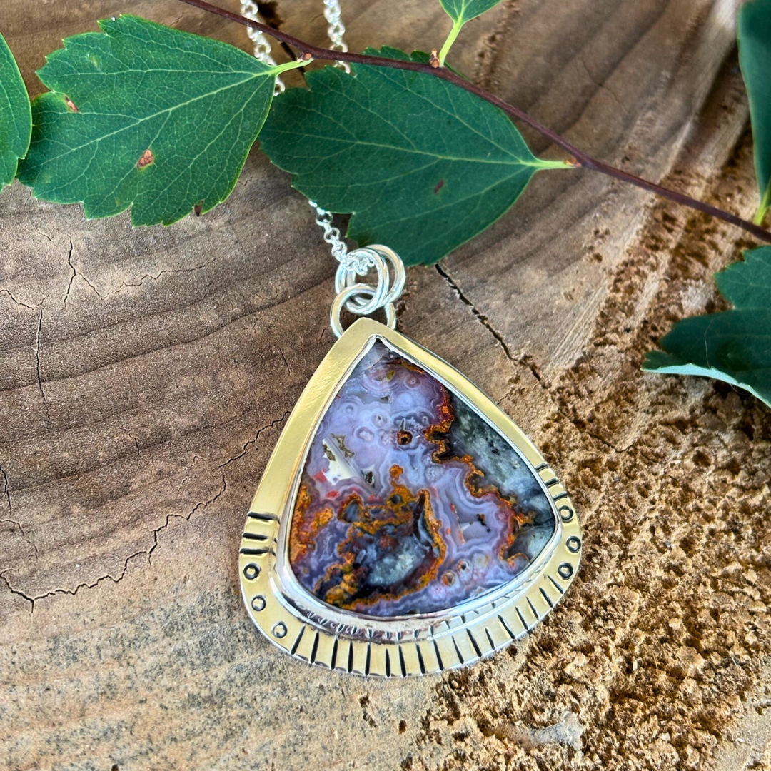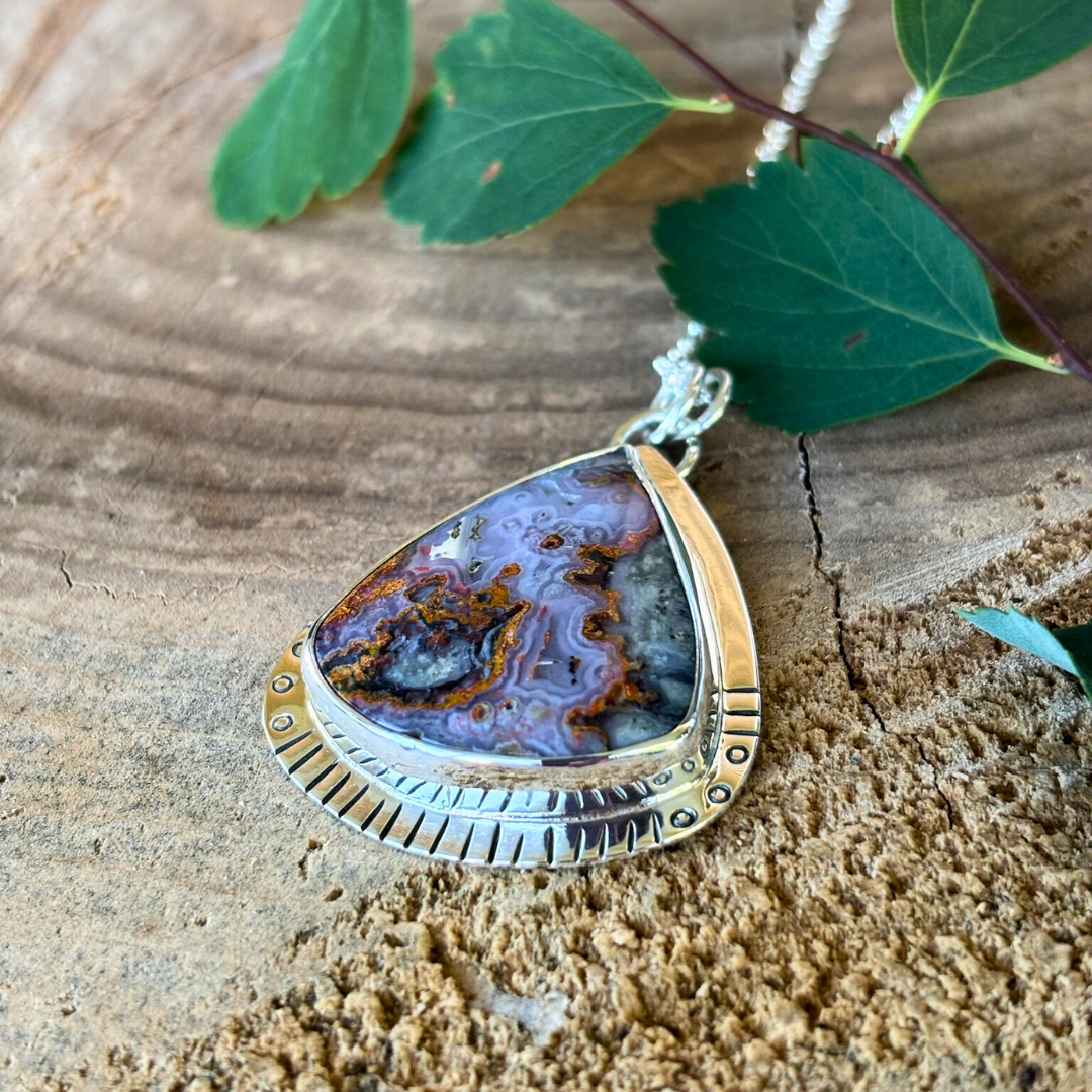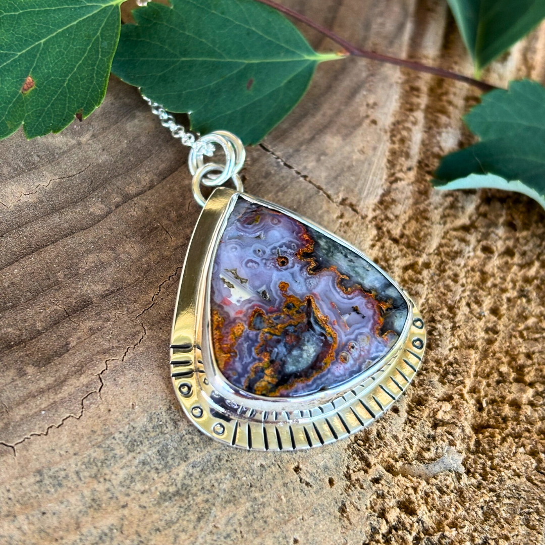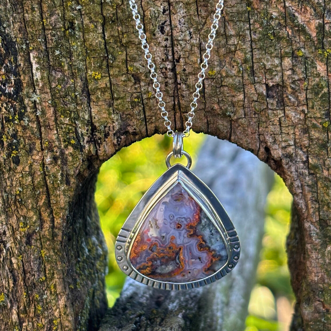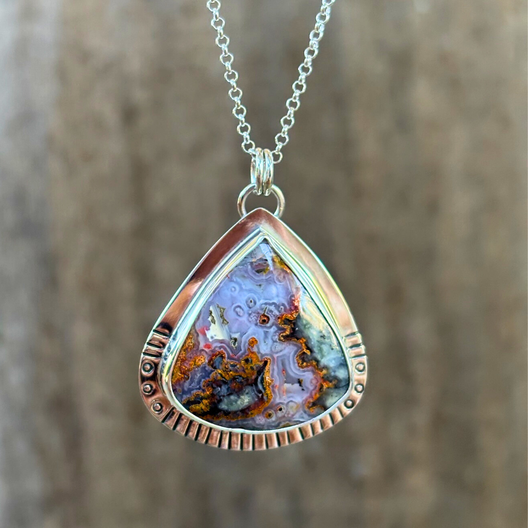 Another eye catching pendant in lava flow jasper. Set in solid sterling silver with hand stamped details.